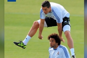 馬塞洛曬出與C羅在皇馬效力期間的合照,內(nèi)容為C羅從馬塞洛的頭上跳過(guò),馬塞洛一臉驚訝。