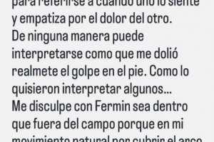 穆索寫道:“感同身受”—這是一句在阿根廷常用的表達(dá),用來(lái)形容一個(gè)人對(duì)別人的痛苦感到同情和理解,這句話絕對(duì)不能被誤解為我的腳真的受傷了。就像有些人試圖解讀的那樣......我在場(chǎng)上和場(chǎng)下都向費(fèi)爾明道歉了,因?yàn)樵谖易匀灰苿?dòng)以保護(hù)球門時(shí),我們發(fā)生了碰撞,這導(dǎo)致他受傷。