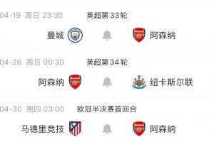 體育資訊04月16日訊 阿森納淘汰葡萄牙體育,晉級(jí)歐冠半決賽,繼續(xù)在英超和歐冠雙線爭(zhēng)冠。4月剩余比賽中,阿森納將接連迎來(lái)曼城、紐卡和馬競(jìng)的挑戰(zhàn)。