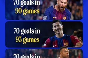 CBS體育曬圖,統(tǒng)計(jì)打進(jìn)歐冠70球的球員用時(shí)場次。其中梅西90場70球歷史最快,萊萬93場70球第二,姆巴佩98場70球第三。