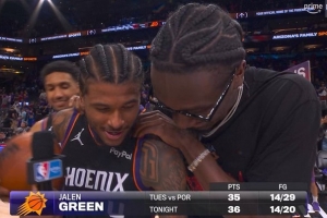 上一場附加賽,杰倫·格林出戰(zhàn)39分鐘,29中14、三分7中2空砍35分5板2助,兩場附加賽轟下71分!