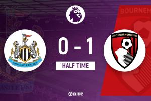 上半場傷停補時2分鐘,半場結束,紐卡斯爾聯(lián)暫0-1伯恩茅斯。