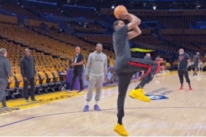 賽前,杜蘭特進行熱身,看來膝蓋傷勢并不嚴(yán)重。