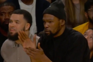GIF-杜蘭特和范弗里特化身啦啦隊(duì) 在場(chǎng)邊加油鼓勁