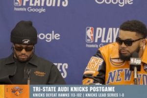 體育資訊4月19日訊 NBA季后賽東部首輪G1,尼克斯113-102戰(zhàn)勝老鷹。賽后,布倫森和唐斯接受媒體采訪,以下為采訪全文。