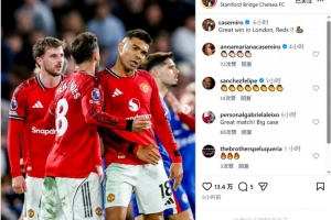 曼聯(lián)中場卡塞米羅社媒曬出與隊友一起慶祝的照片,配文:“在倫敦收獲一場重要勝利,紅魔!”