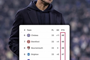在英超積分榜上,切爾西以48分位居第6,但僅僅領(lǐng)先位居第12的富勒姆3分,而且布倫特福德和伯恩茅斯和藍(lán)軍積分相同。